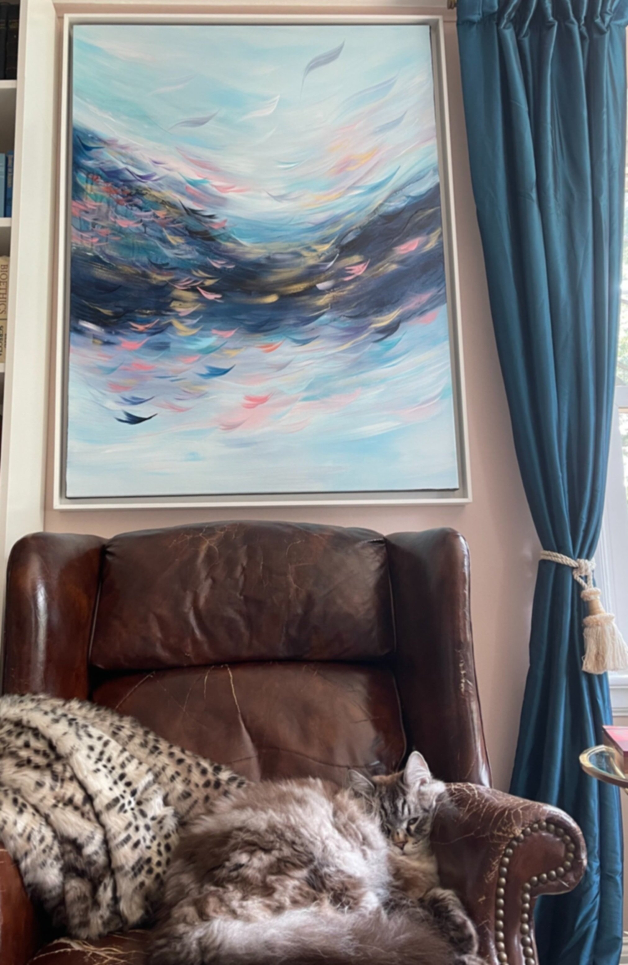 "My husband and I fell in love with one of Maryam’s paintings, but it wasn’t the right size for our space. We asked her if she could do something similar and she created a beautiful one-of-a-kind piece with the same color palette. We are delighted with the result! If you are on the fence about a commission, go for it. It’s a magical experience to watch a piece of art being created just for you!"