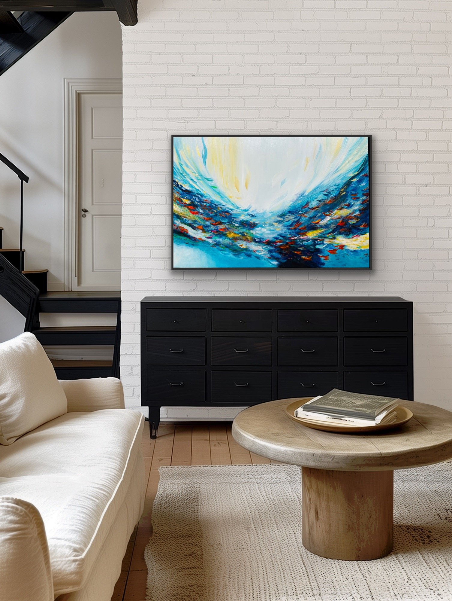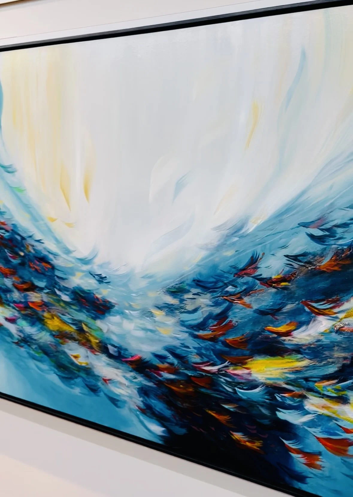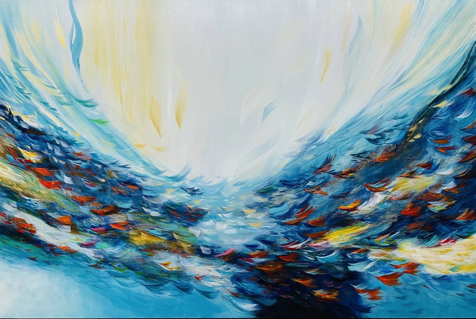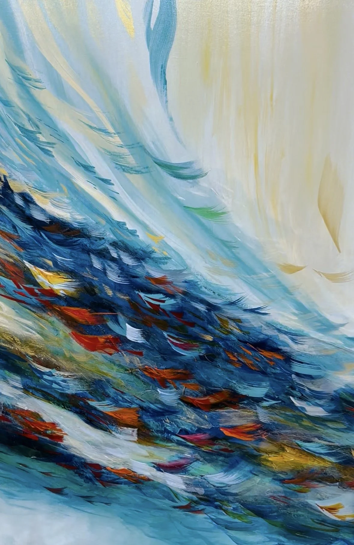 This painting has a striking contrast between the dark, infinite background and the vibrant, dynamic streaks of colour, resembling birds, feathers, or fragments in motion. It conveys a sense of movement, vibrancy, and freedom breaking through stillness.