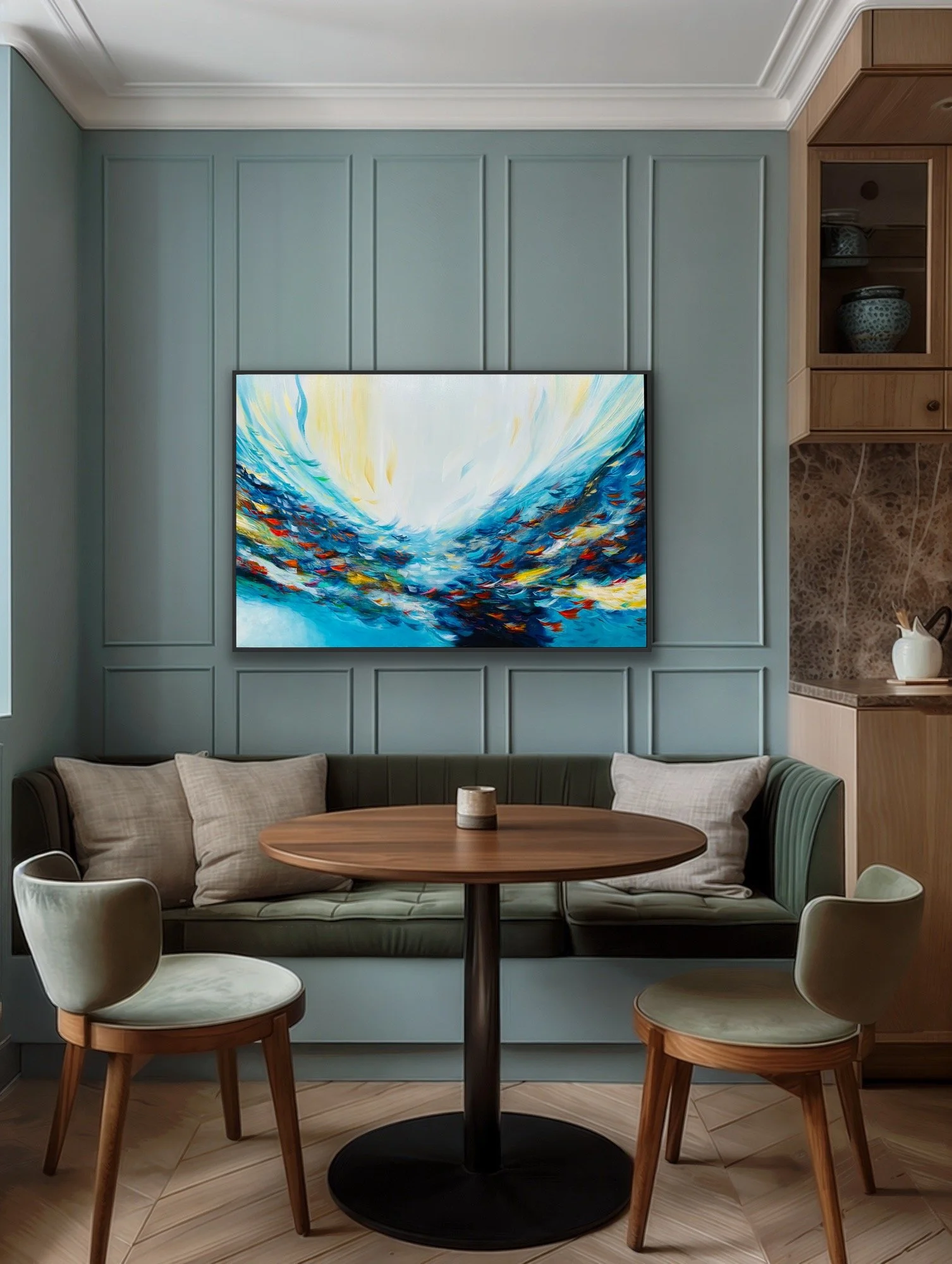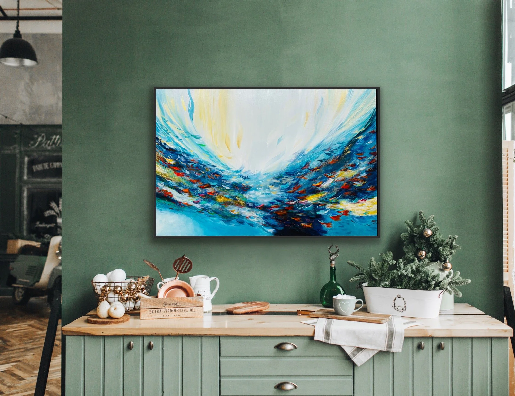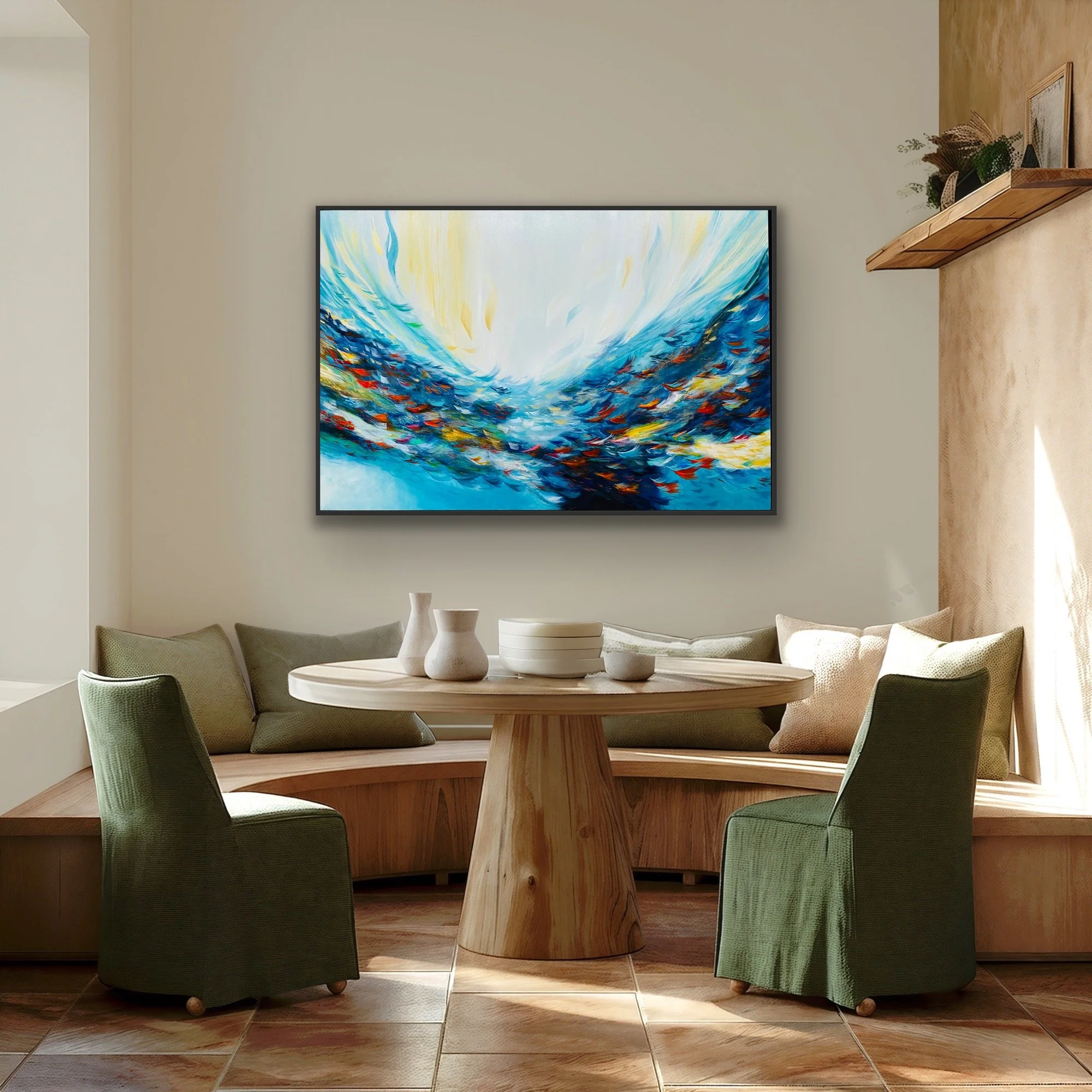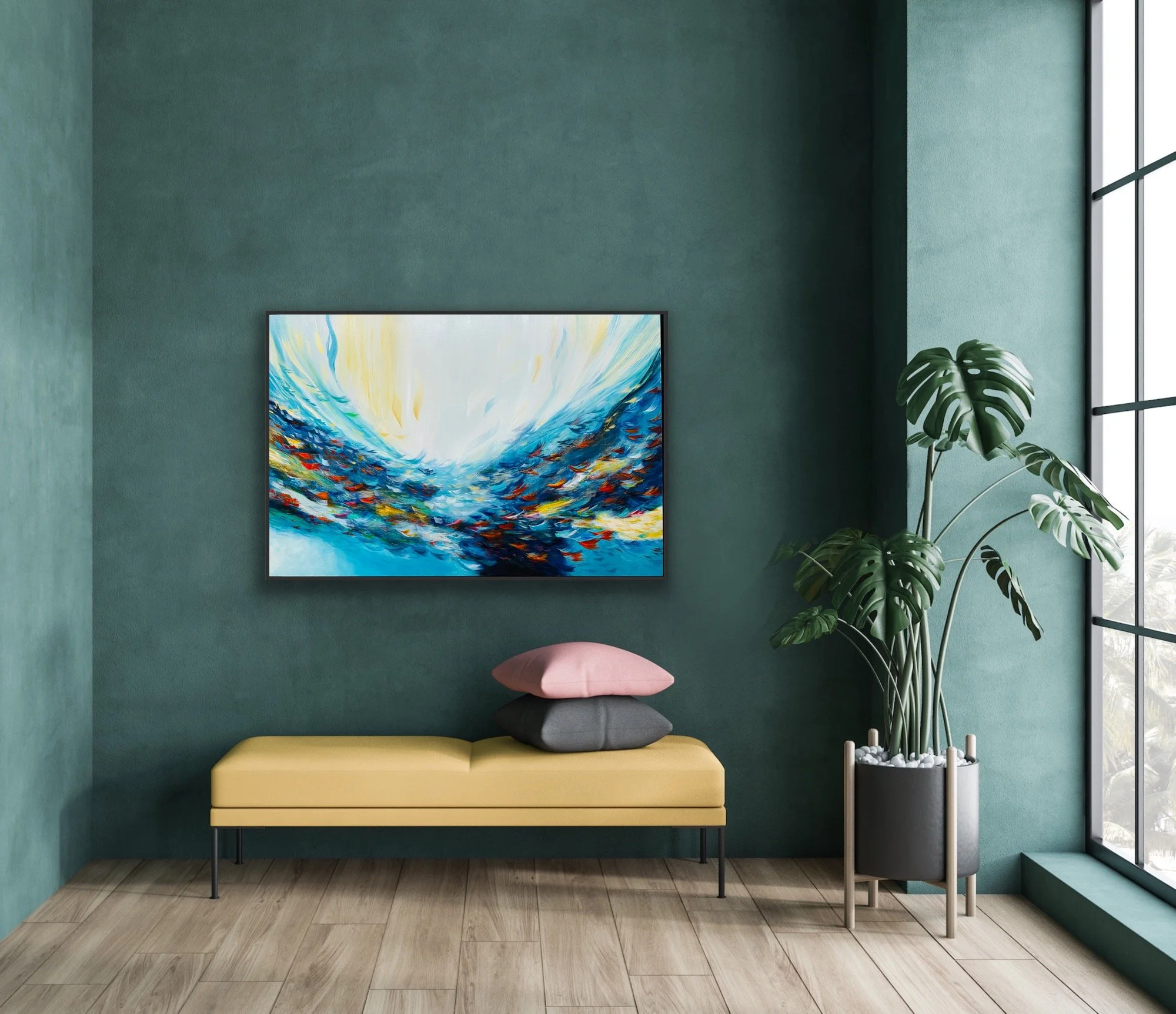 This painting has a striking contrast between the dark, infinite background and the vibrant, dynamic streaks of colour, resembling birds, feathers, or fragments in motion. It conveys a sense of movement, vibrancy, and freedom breaking through stillness.