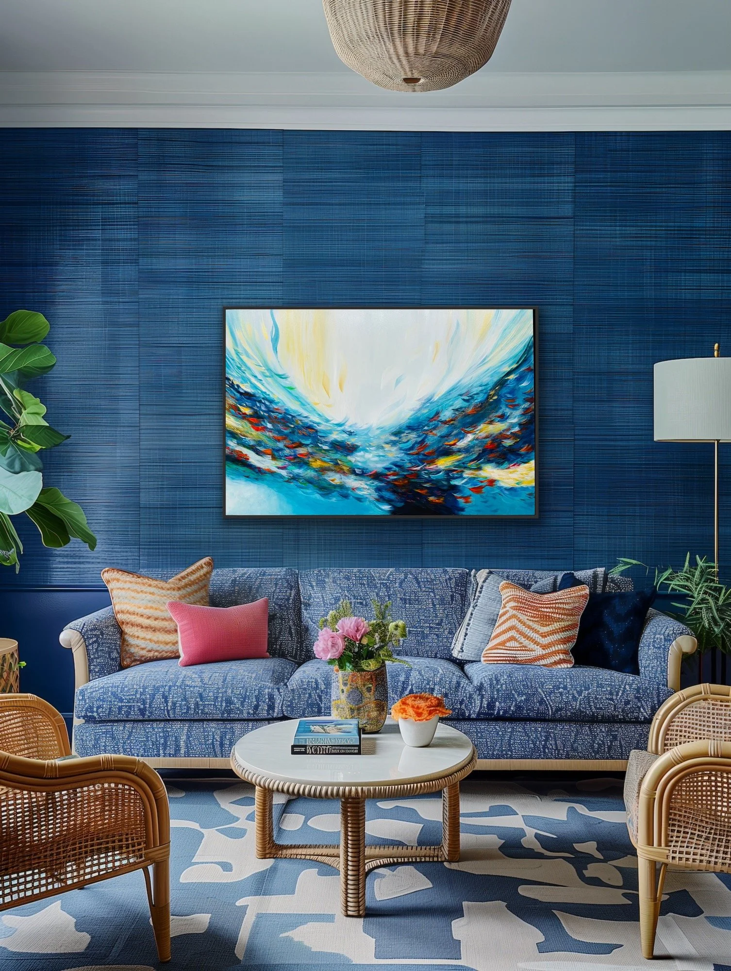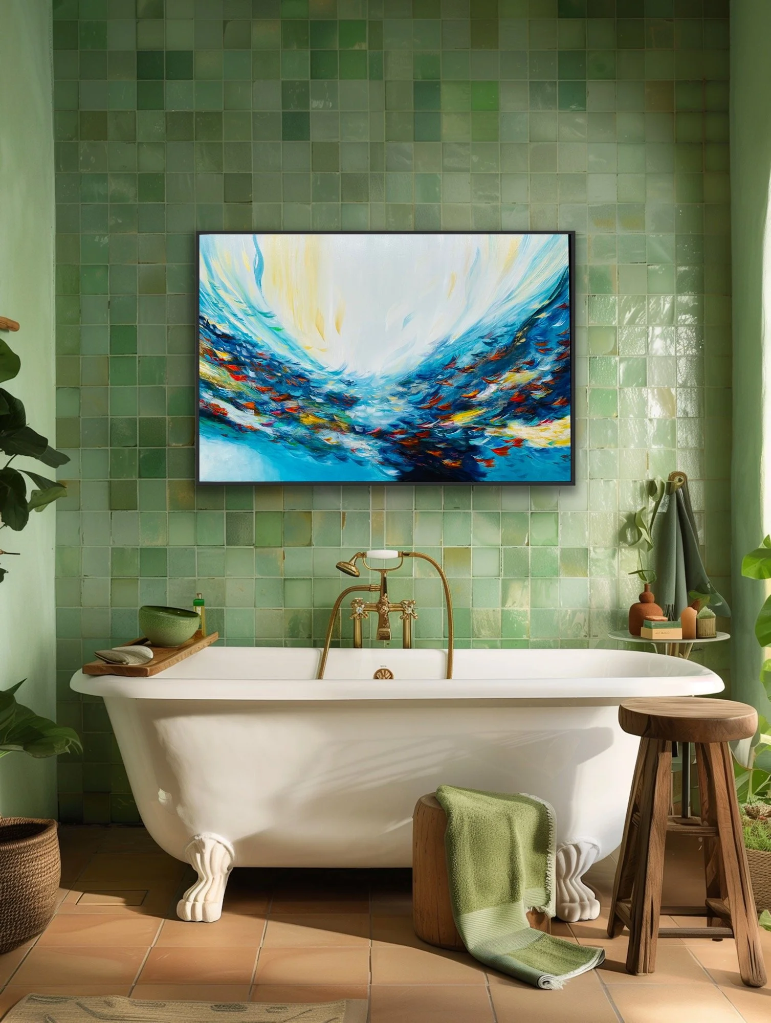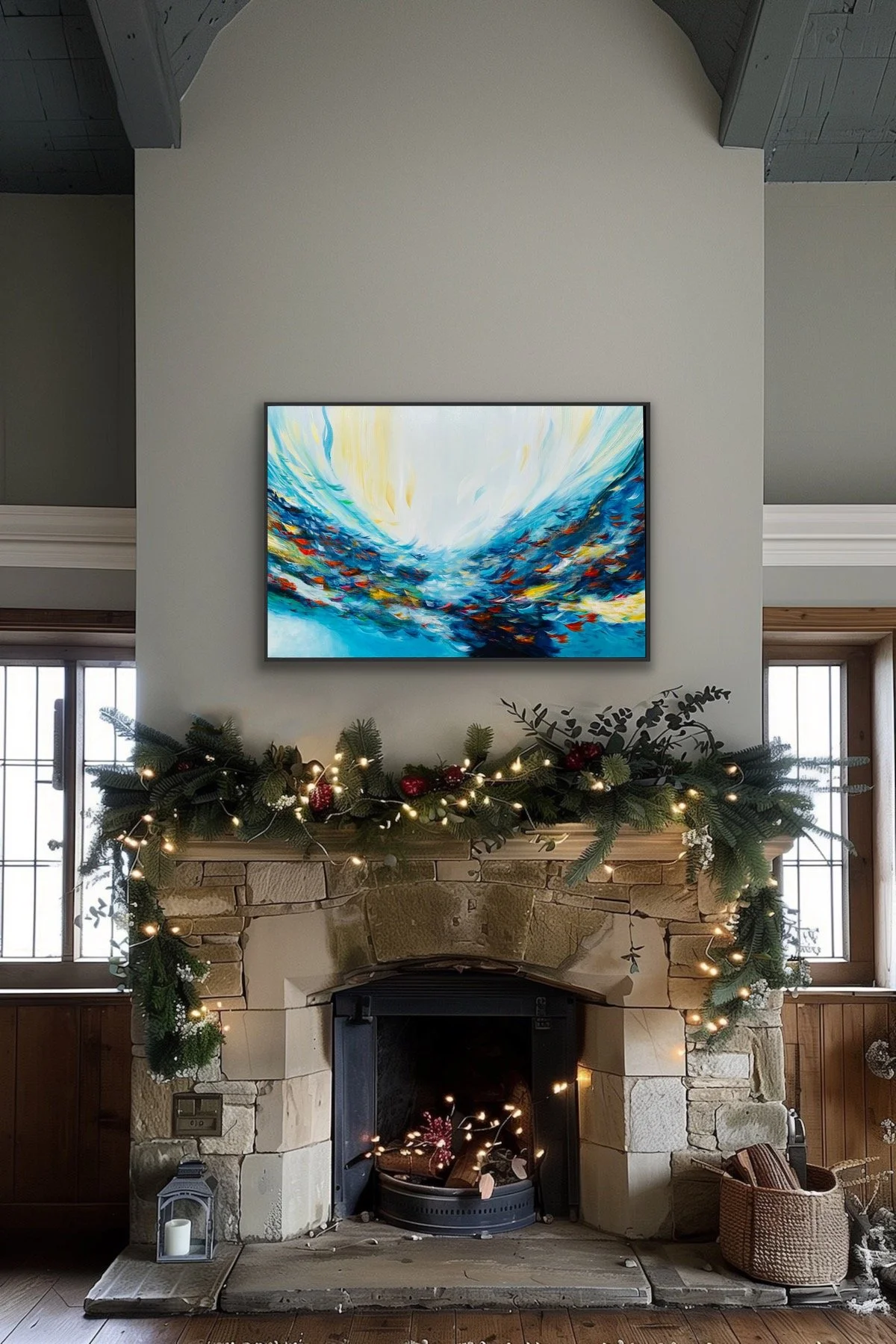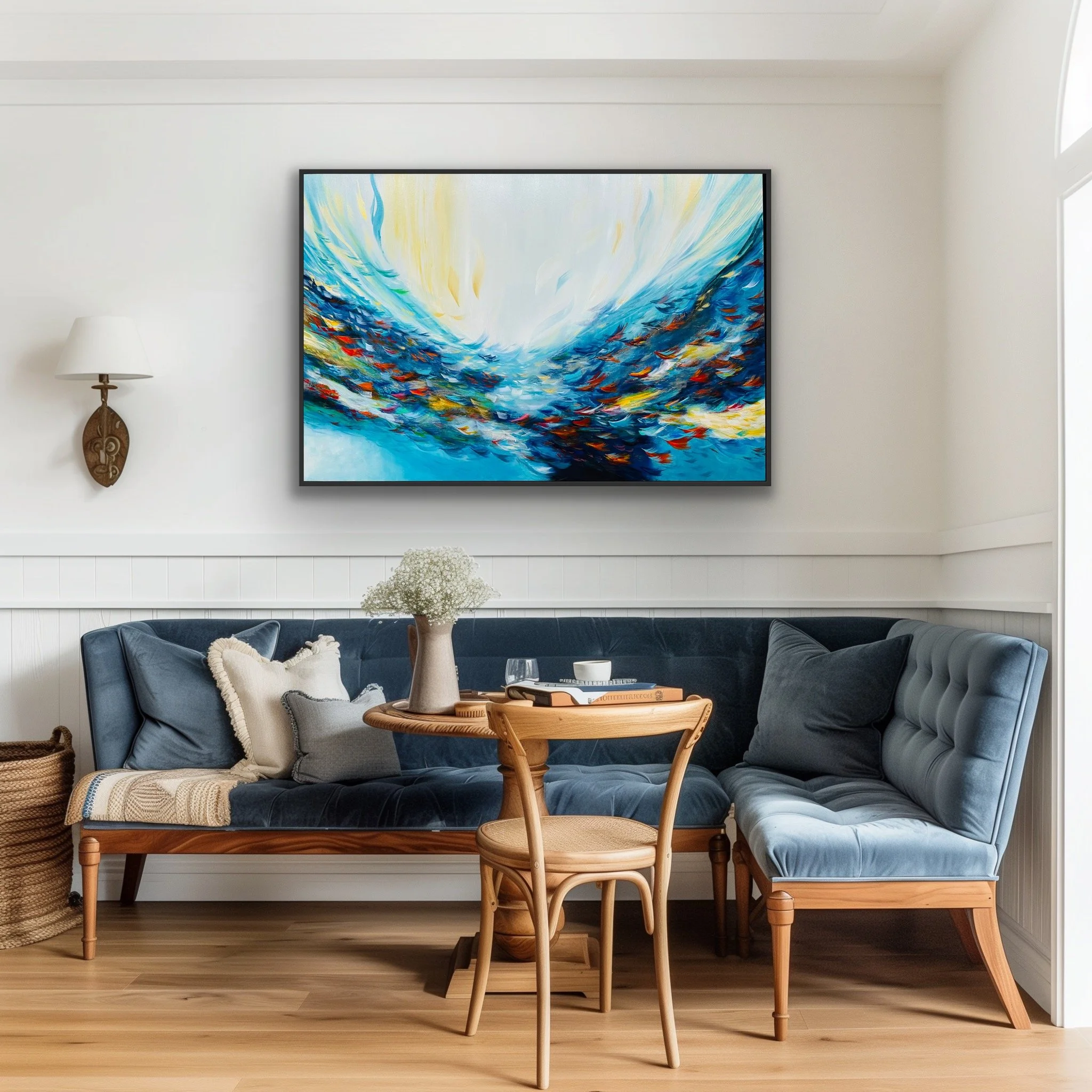 This painting has a striking contrast between the dark, infinite background and the vibrant, dynamic streaks of colour, resembling birds, feathers, or fragments in motion. It conveys a sense of movement, vibrancy, and freedom breaking through stillness.