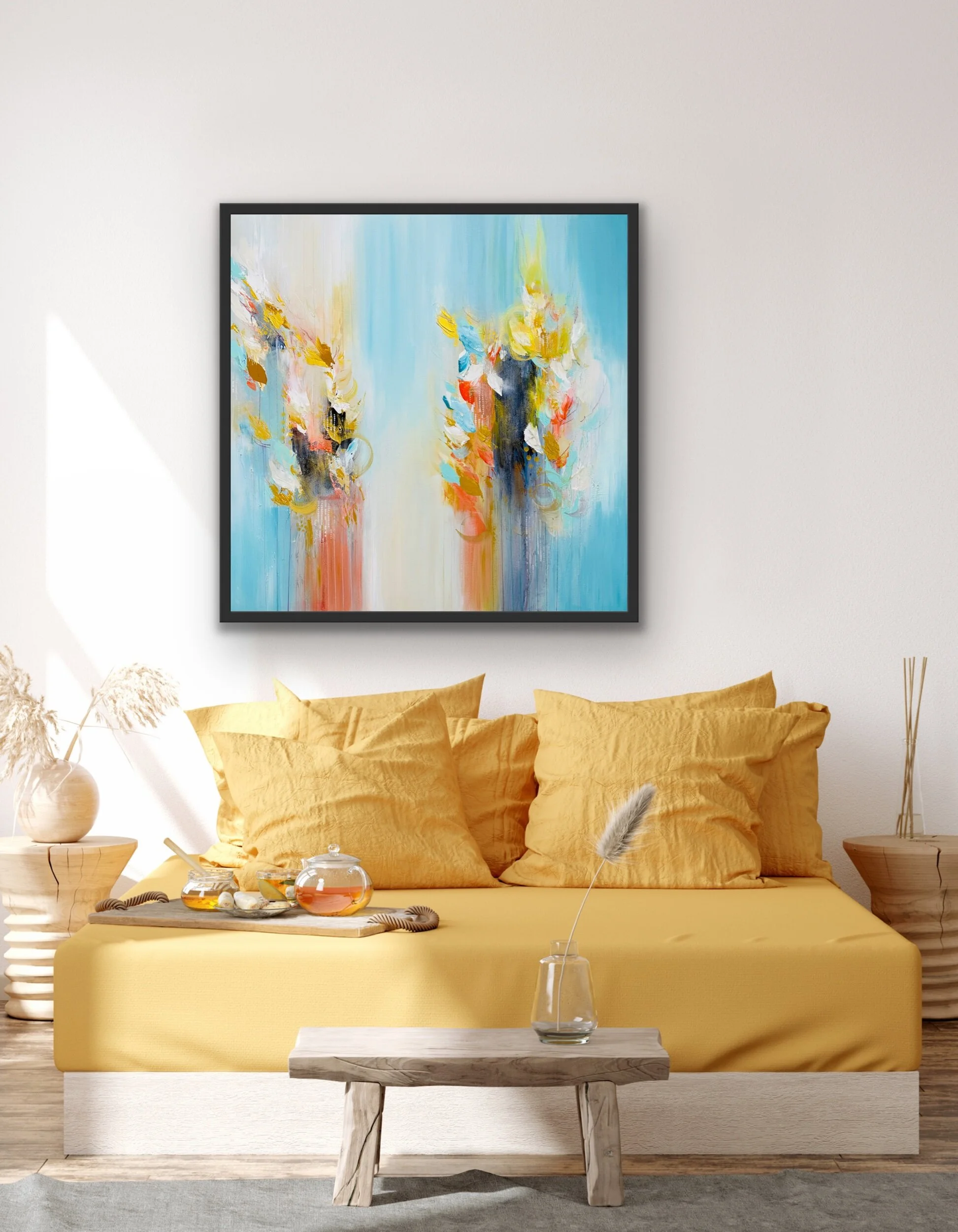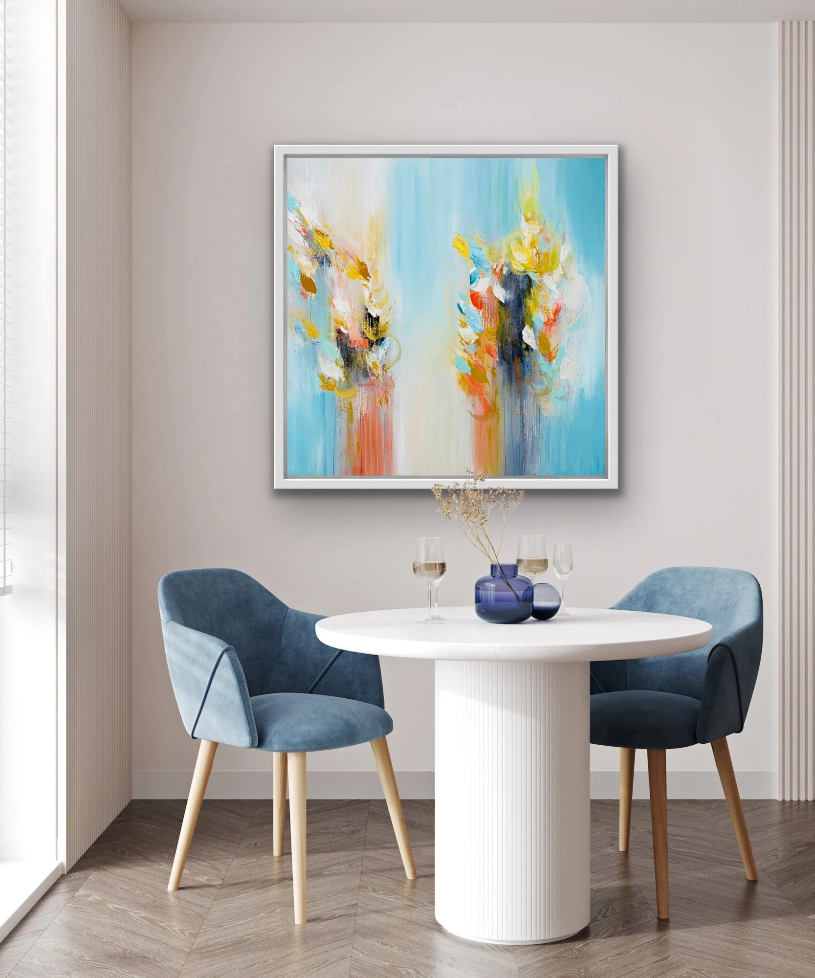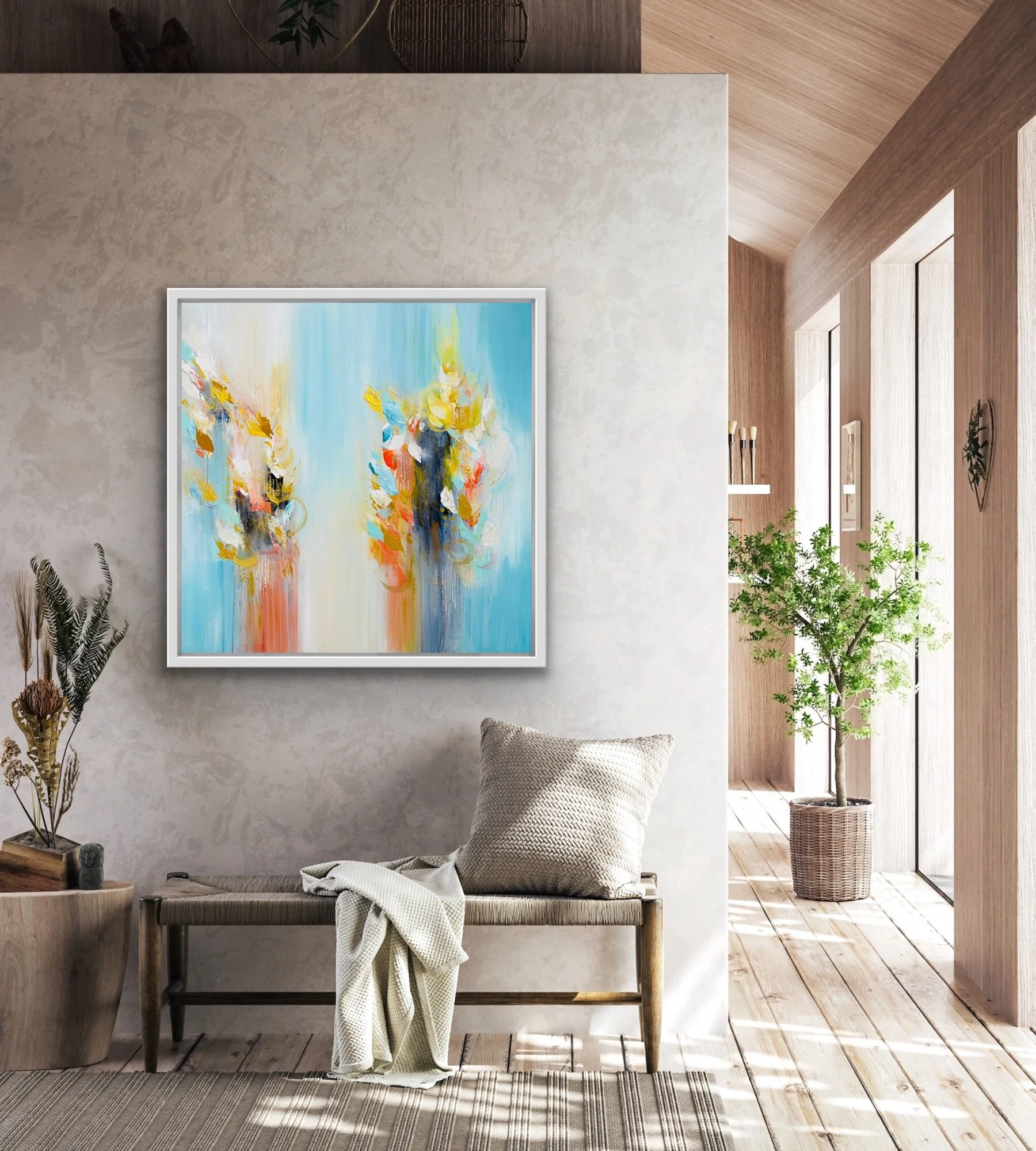 All the canvases are gallery wrapped and 1.5 inches in depth which means there is no immediate need for framing. In many cases the painting is ready to hang in a simple way. However a very simple narrow floating frame compliments the art work. All pieces are hardware ready for hanging. All the art work is applied with two coats of varnish to protect it from the damage caused by dust and water.